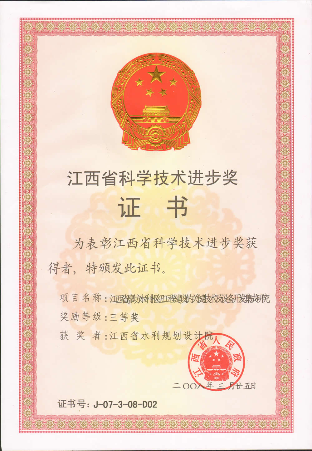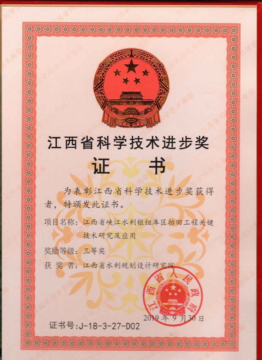 • 省科学技术进步奖:峡江水利枢纽库区抬田工程关键技术研究及应用