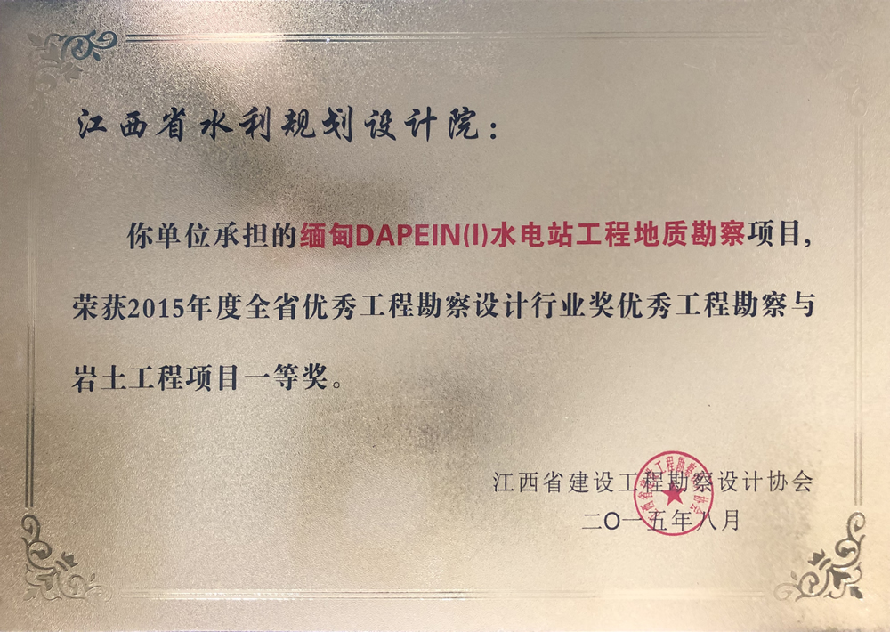 • 省优秀勘测设计一等奖:缅甸DPAEIN(Ⅰ)水电站工程地质勘察项目