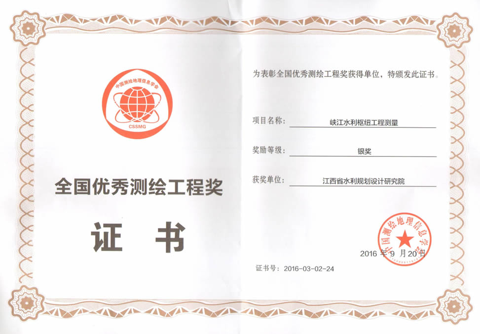 • 全国优秀测绘工程奖:峡江水利枢纽工程测量