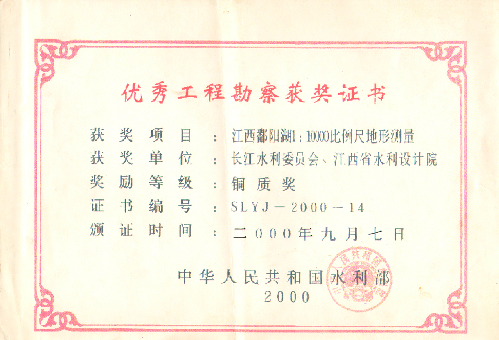 • 全国优秀勘测设计铜奖:江西鄱阳湖110000比例尺地形测量