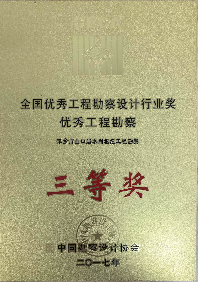 • 全国优秀勘测设计三等奖:萍乡市山口岩水利枢纽工程勘察
