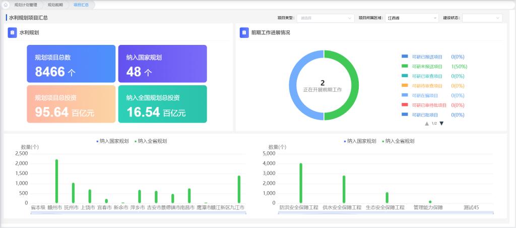 规划计划管理平台建设,主要以水利规划编制过程调度、重点规划项目前期工作调度管理和水利项目投资计划执行调度为业务核心,通过自主填报或Excel导入功能,对水利规划编制及水利工程前期工作调度和投资计划执行等管理提供支持,通过设置省、市、县三级管理账号,实现各级单位对水利规划计划的有序组织、管理和分析。