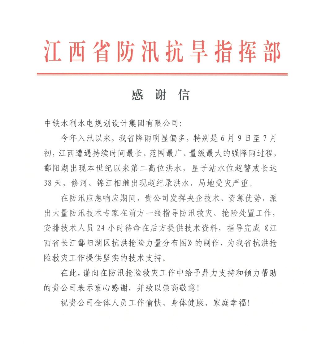 省防汛抗旱指挥部向集团公司致感谢信