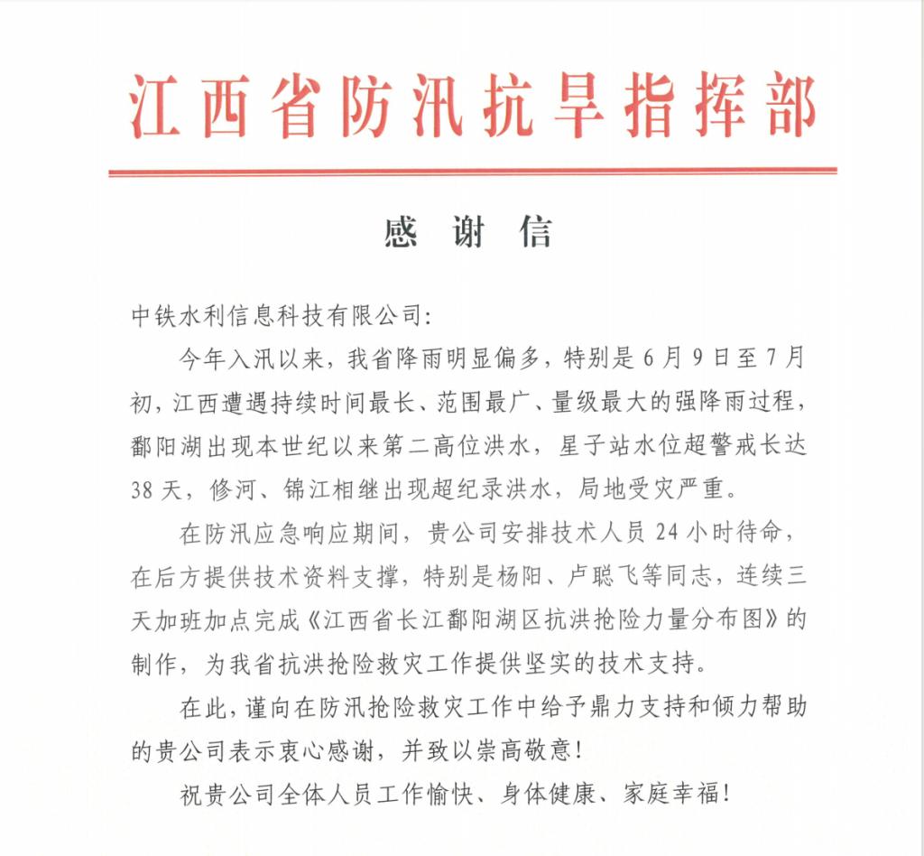 省防汛抗旱指挥部向中铁水利信息致感谢信