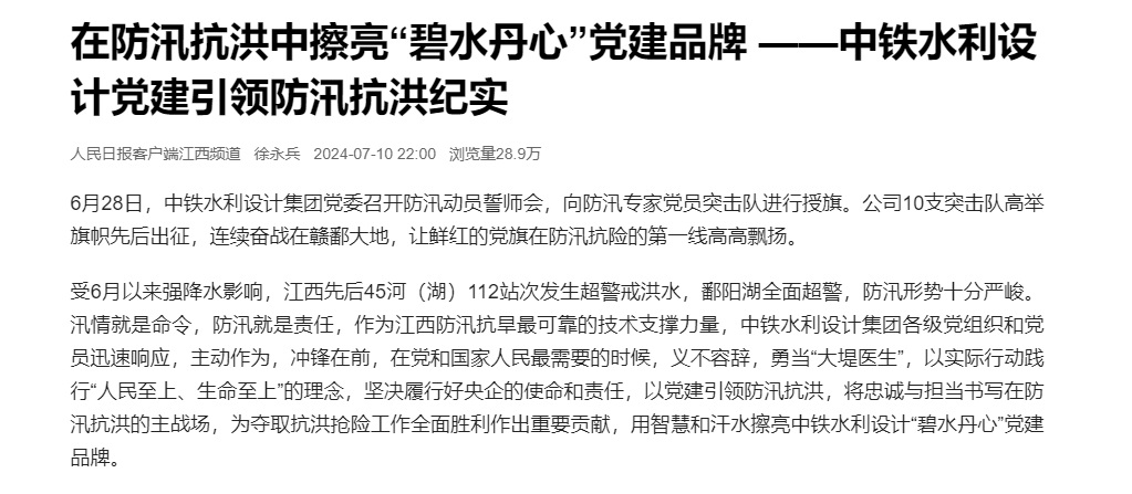 2024710日,人民日报刊发《在防汛抗洪中擦亮“碧水丹心”党建品牌》。作品以党建引领助力江西防汛为视角,从领导干部、党员、党组织三个层面报道了集团公司深化“碧水丹心”党建品牌创建,以实际行动积极履行社会责任的事迹。