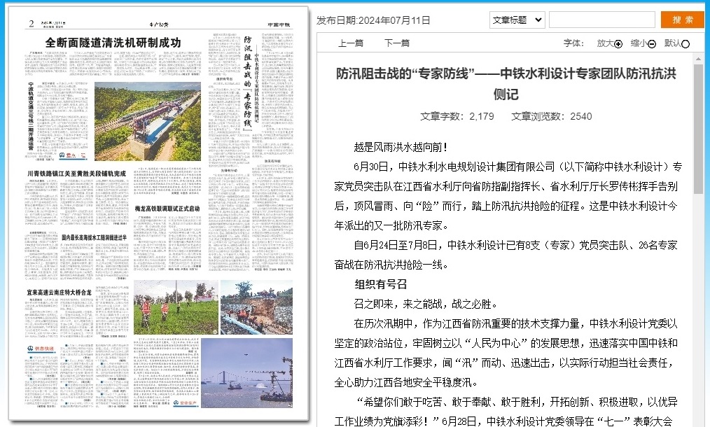 2024711日,《中国中铁》报刊发《防汛阻击战的“专家防线”——中铁水利设计专家团队防汛抗洪侧记》。该通讯从不同维度全景展现了集团公司选派防汛专家奔赴防汛一线,切实发挥专业优势,助力江西防汛的有关事迹。