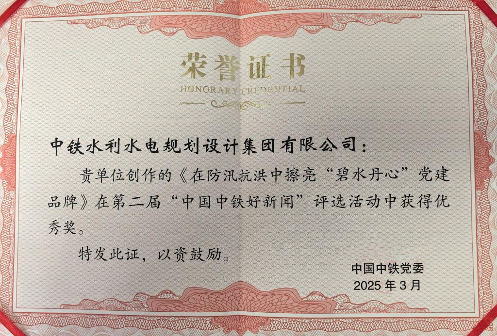 近日,股份公司党委表彰了中国中铁2024年度新闻宣传工作优秀作品。中铁水利设计报送的新闻作品《在防汛抗洪中擦亮“碧水丹心”党建品牌》喜获第二届“中国中铁好新闻”优秀奖。