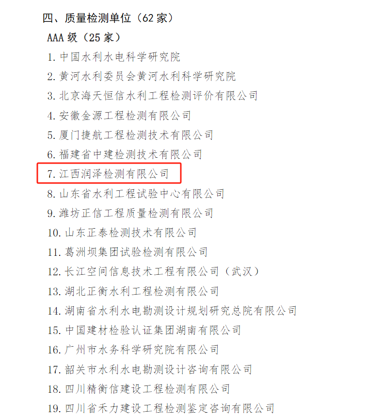 近日,江西润泽检测有限公司在全国水利建设市场主体信用评价中脱颖而出,荣获最高信用等级“AAA级”。这一殊荣不仅是对公司长期以来坚持高标准、严要求的质量检测工作的肯定,更是对公司专业能力和服务水平的认可。