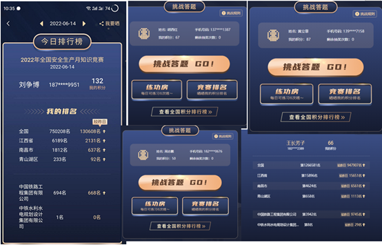 今年6月是第21个全国“安全生产月”,主题是“遵守安全生产法 当好第一责任人”。为深入贯彻落实习近平总书记关于安全生产重要论述,学习股份公司和集团公司重要指示批示精神,进一步强化安全生产责任落实,全力抓好安全生产工作,移民环保院领导以《2022年全国安全生产月知识竞赛》和《中国中铁职工安全生产月答题竞赛》两个活动为契机,积极宣传引导本院职工学习《新安全生产法》和《中国中铁股份有限公司安全质量管理系统提升实施方案》,院全体干部职工积极主动参与学习,瞬间掀起学习浪潮,并在近段时间,相继涌现出多名“新安法知多少”竞赛答题之星(全部15题通关)。