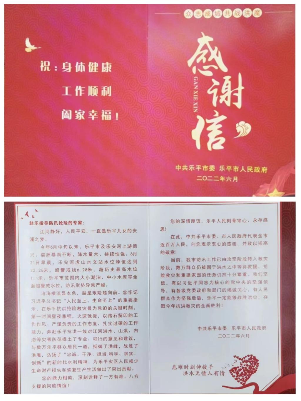 6月24日,中共乐平市委、乐平市人民政府发来一封感谢信,感谢我司地勘院防汛专家黄红儒和许俊在乐平抗洪一线对江河洪水、山洪、内涝等灾害防范提出了专业、可行的意见和建议,与数万乐平群众居民一道,抵御了洪峰,战胜了洪魔,弘扬了“忠诚、干净、担当,科学、求实、创新”的新时代水利精神。他们用行动深刻诠释了一方有难、八方支援的同胞情谊。