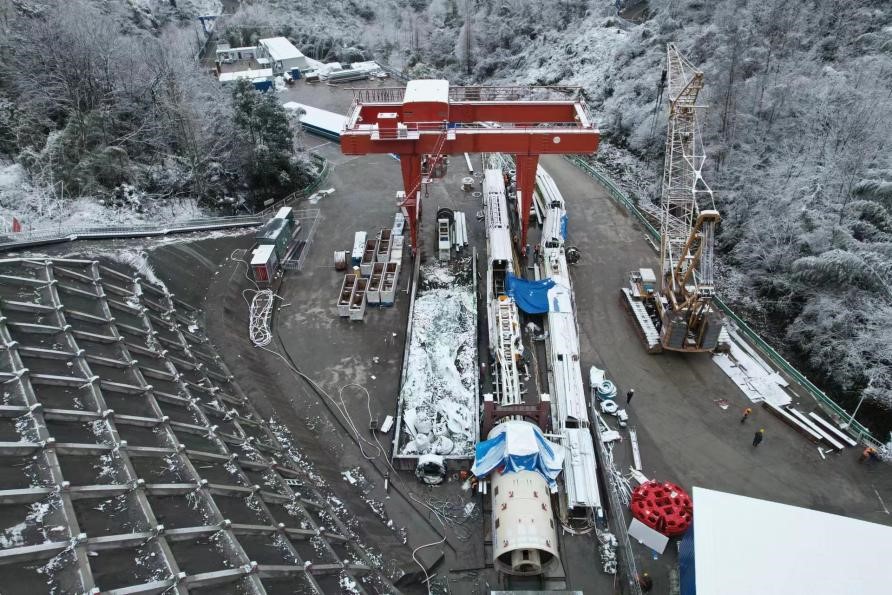 技术赋能,项目推进也提质升级。本项目选择TBM总长181米,设备刀盘最大直径4.1米,重400吨,具有开挖、出渣、管片安装、测量导向、视频监控、超前地质预报等全面的功能,可有效应对及解决断层破碎带围岩坍塌及突泥涌水等技术难点和风险,确保安全、快速完成隧洞掘进。2024年1月28日,TBM顺利始发。截止9月中旬,TBM已顺利掘进约1800m,最大日进尺22m,最大月进尺超400m;隧洞掘进已经完成约55.4%,预计今年年底贯通。