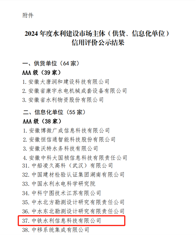 近日,中国水利工程协会公示了2024年度水利建设市场主体(供货、信息化单位)信用评价结果,中铁水利信息凭借优秀的综合实力和良好的信用记录,再次荣获“全国水利建设市场主体(供货、信息化单位)AAA级最高信用等级企业”,也是江西省唯一一家信息化类上榜单位。